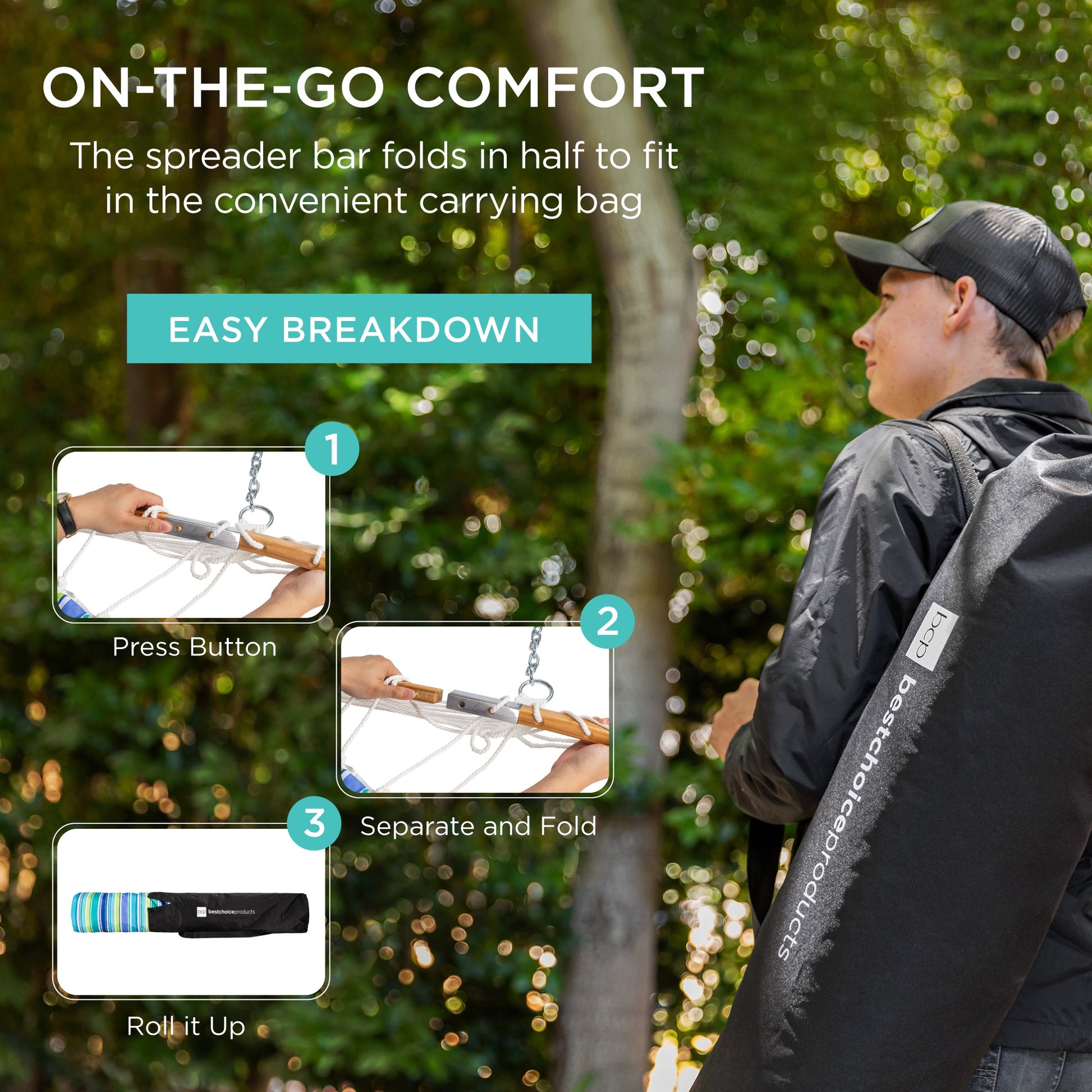 • ON THE GO COMFORT: The two spreader bars split in half for convenient storage while an included carrying bag lets you take this hammock anywhere!