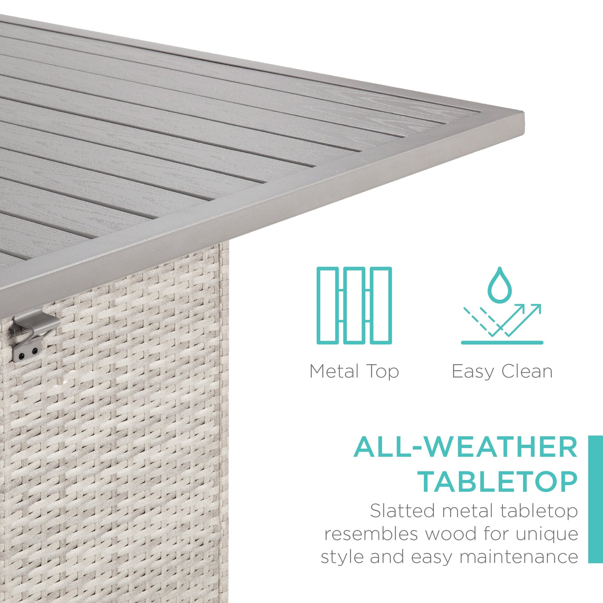 • UNIQUE DESIGN: Eye-catching style is comprised of a wicker stand that leads up to a slatted metal tabletop, providing unique style and automatic drainage through the cracks during rain or a hose-down