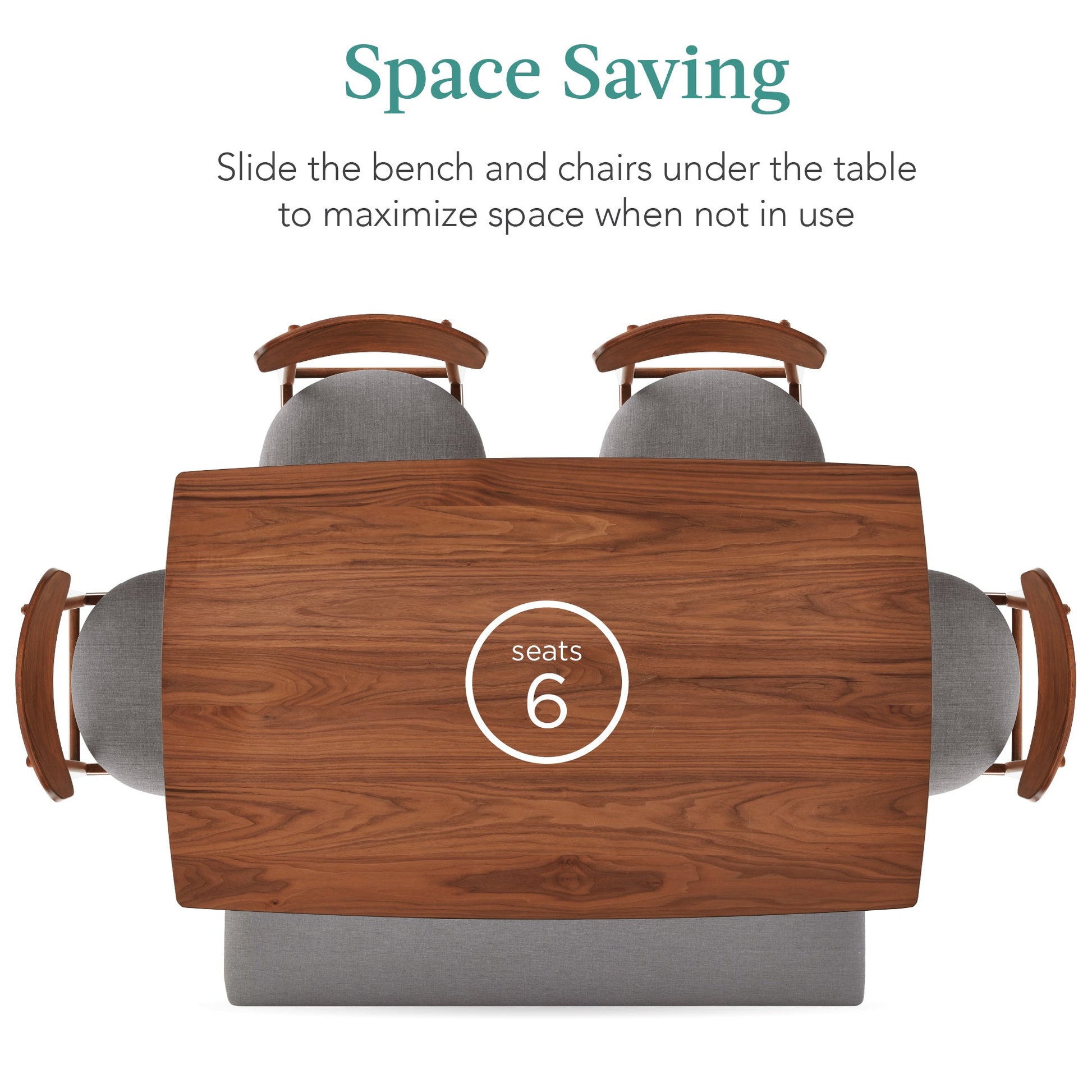 6-Piece Mid-Century Modern Upholstered Wooden Dining Set w/ 4 Chairs, Bench