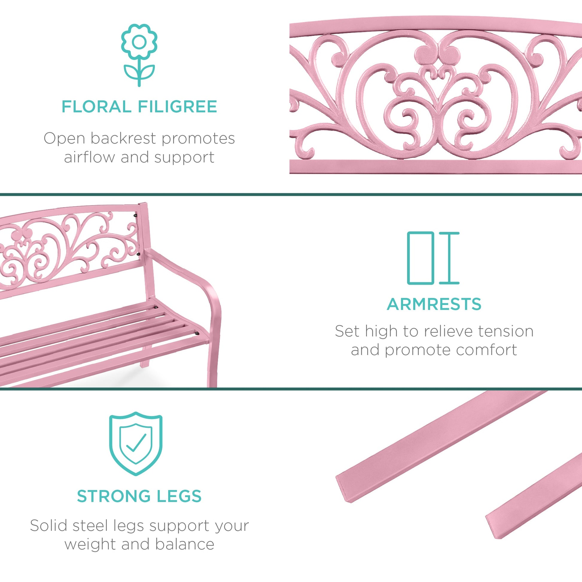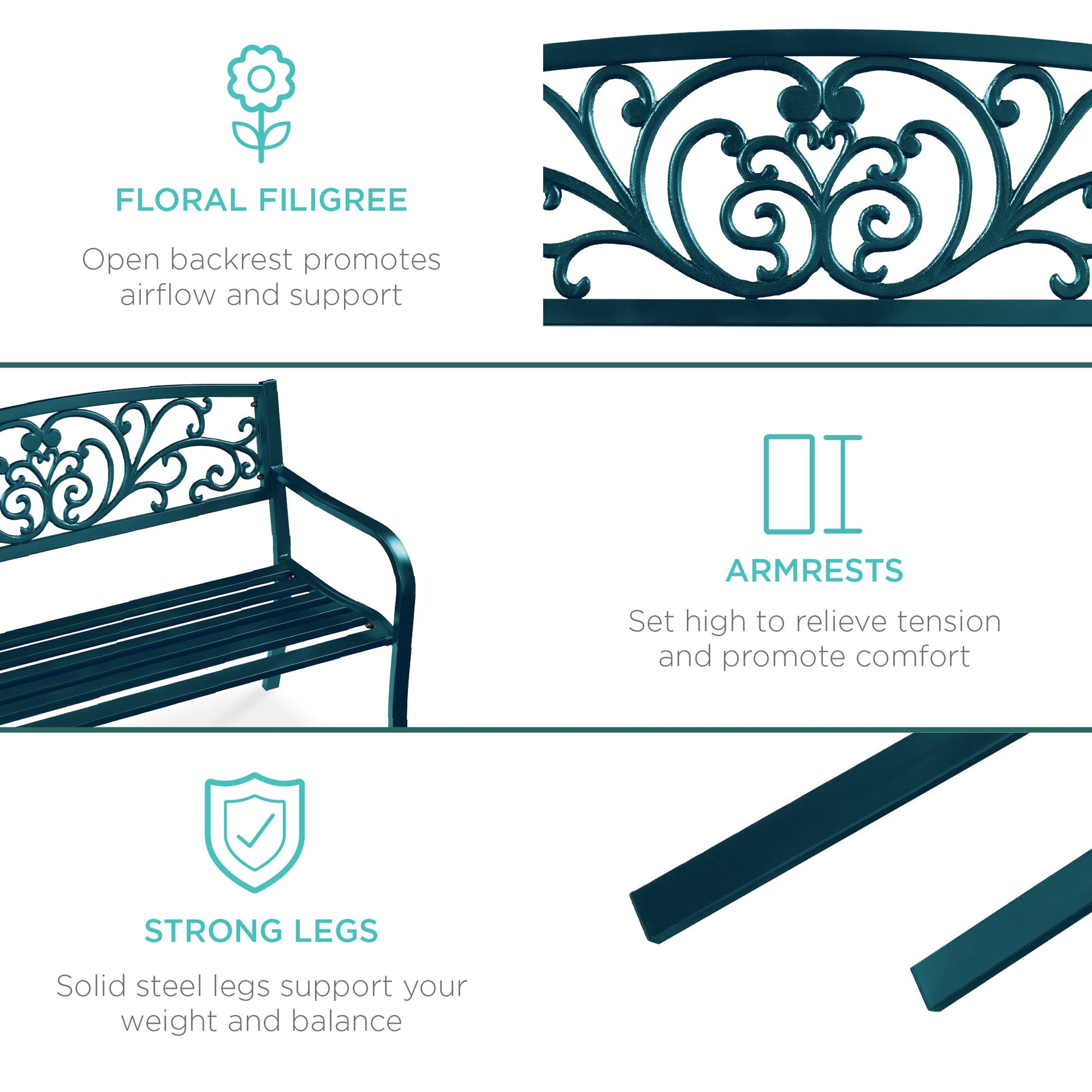 • ERGONOMIC OUTDOOR FURNITURE: Beautifully detailed with a floral accented backrest to promote airflow and a set of armrests to relieve tension and enhance your comfort